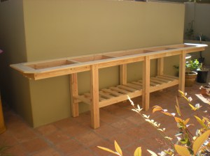 Stay tuned for more pictures of it filled with beautiful heads of lettuce and strawberries. Note the super cool pot shelf underneath. We were at the nursery and saw a similar table with a shelf – so he came home and just added it. I love having a handy hubby.