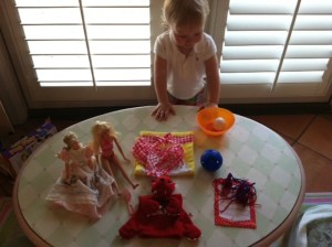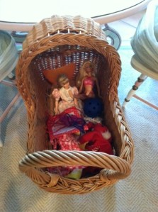 This week, Bay chose the baby buggy that once belonged to her Aunt Ali and myself as her method of transportation of her treasure. The contents? Why Barbies, of course.