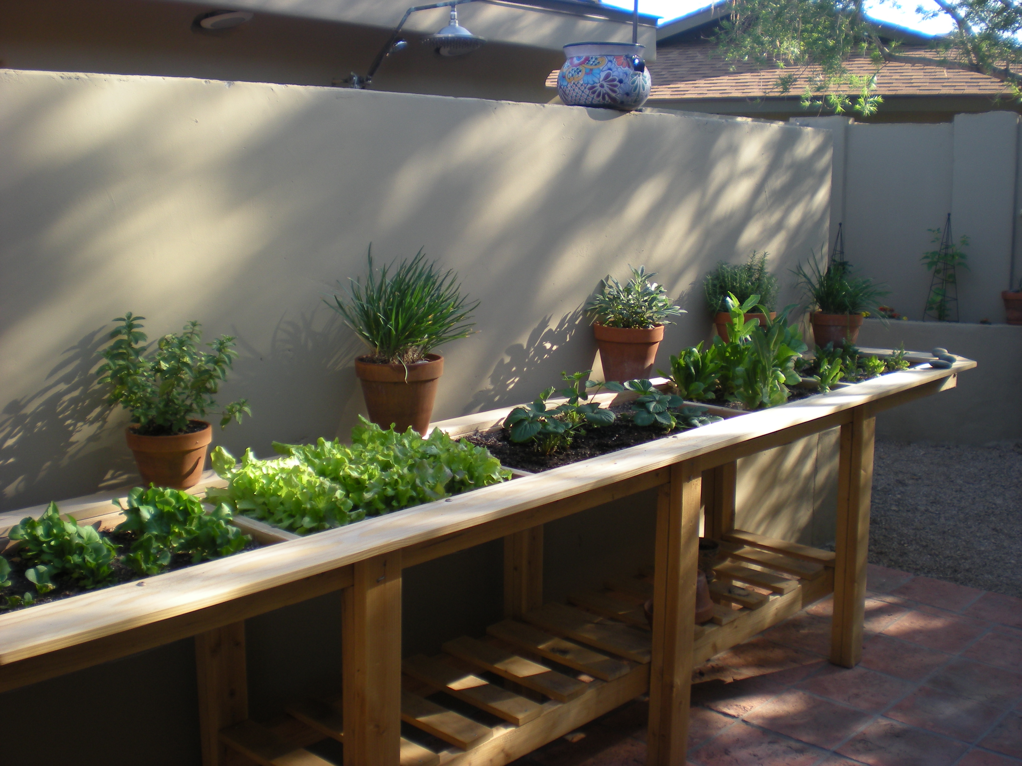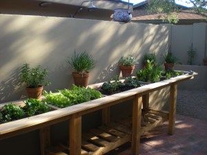 The  beautiful lettuce table that Peter built for me in January? Well! Now it looks like this: