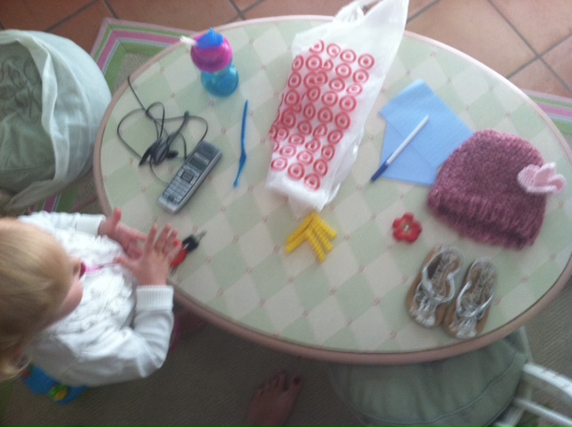 Yesterday she walked into the office with the knit hat on and the keys in her hand, said “bye bye!” gave me a kiss and headed out of the room. I thought it was adorable…until I realized she might actually be heading somewhere!