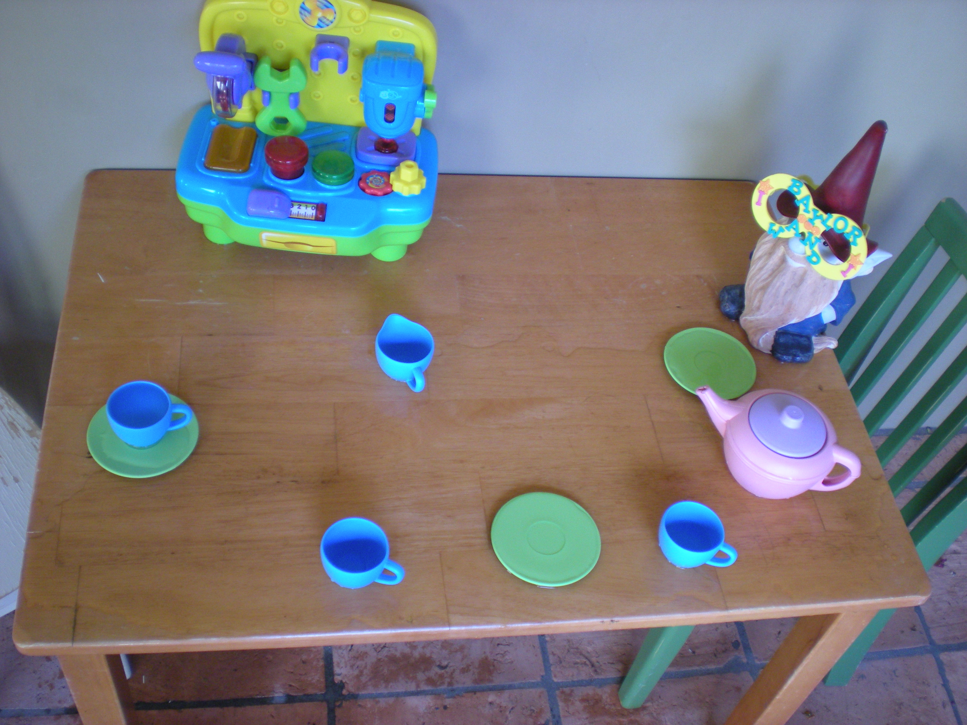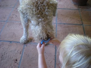 In our ongoing quest to stay cool and have some fun outside the house, Baylor and I have tea parties. She gets to take a bottle of water and pour it into her tea pot. Then she gets to pour the “tea” into the tea cups and serve Tome, Bear, Barbie, Mommy and herself. The best part is that she spills the majority of the “tea” all over herself thus keeping cool while having some fun. And she gets some water without me having to add juice to make it enticing. Win. Win. And one more win.