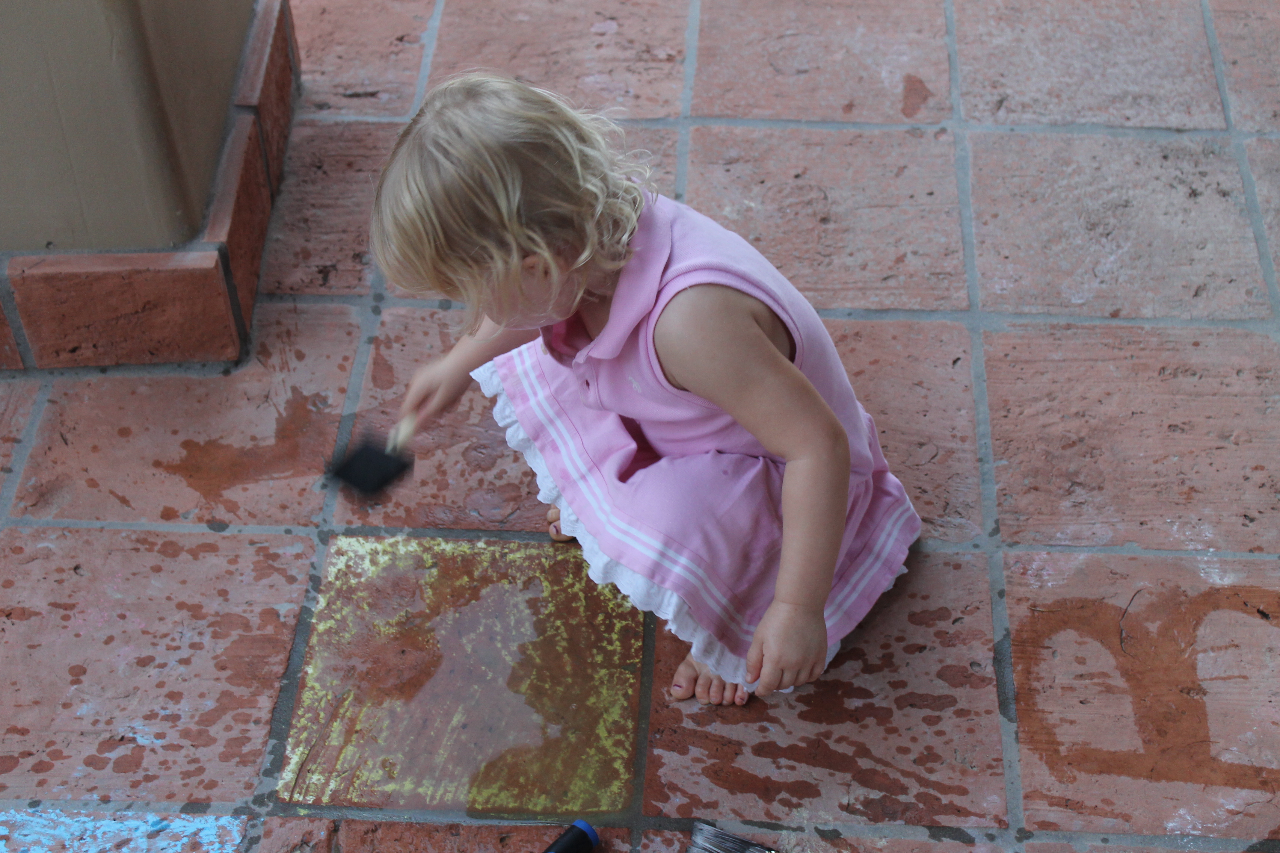 Anyway, it’s finally cooled down a little and we’ve been so happy to have all the doors and windows open all the time. This also means we’ve been playing outside as much as possible. We broke out the water table and toys, the sidewalk chalk and the paint brushes. Yes, I said paint brushes.