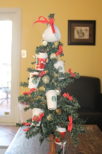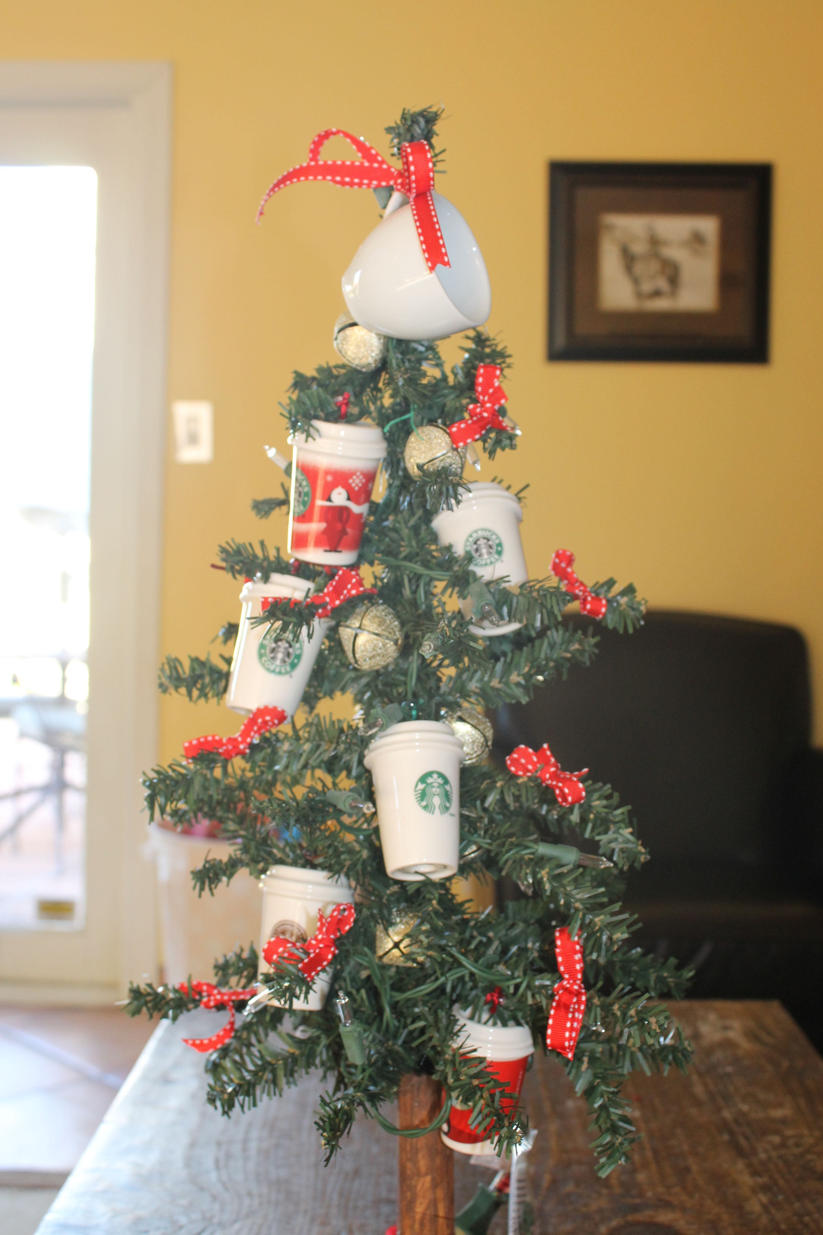 I love making mini Christmas trees. They are so fun to dream up, to create and so fun to give as gifts. Peter’s mom and dad are both UofA grads as well so their tree is a UofA theme with all four of our graduation pictures as ornaments. My mom has one with an ornament for each of the kid’s family’s. I have aspirations to make one for Bay with a picture from each Christmas, but I haven’t found the right inspiration yet. But I did find inspiration with some coffee…