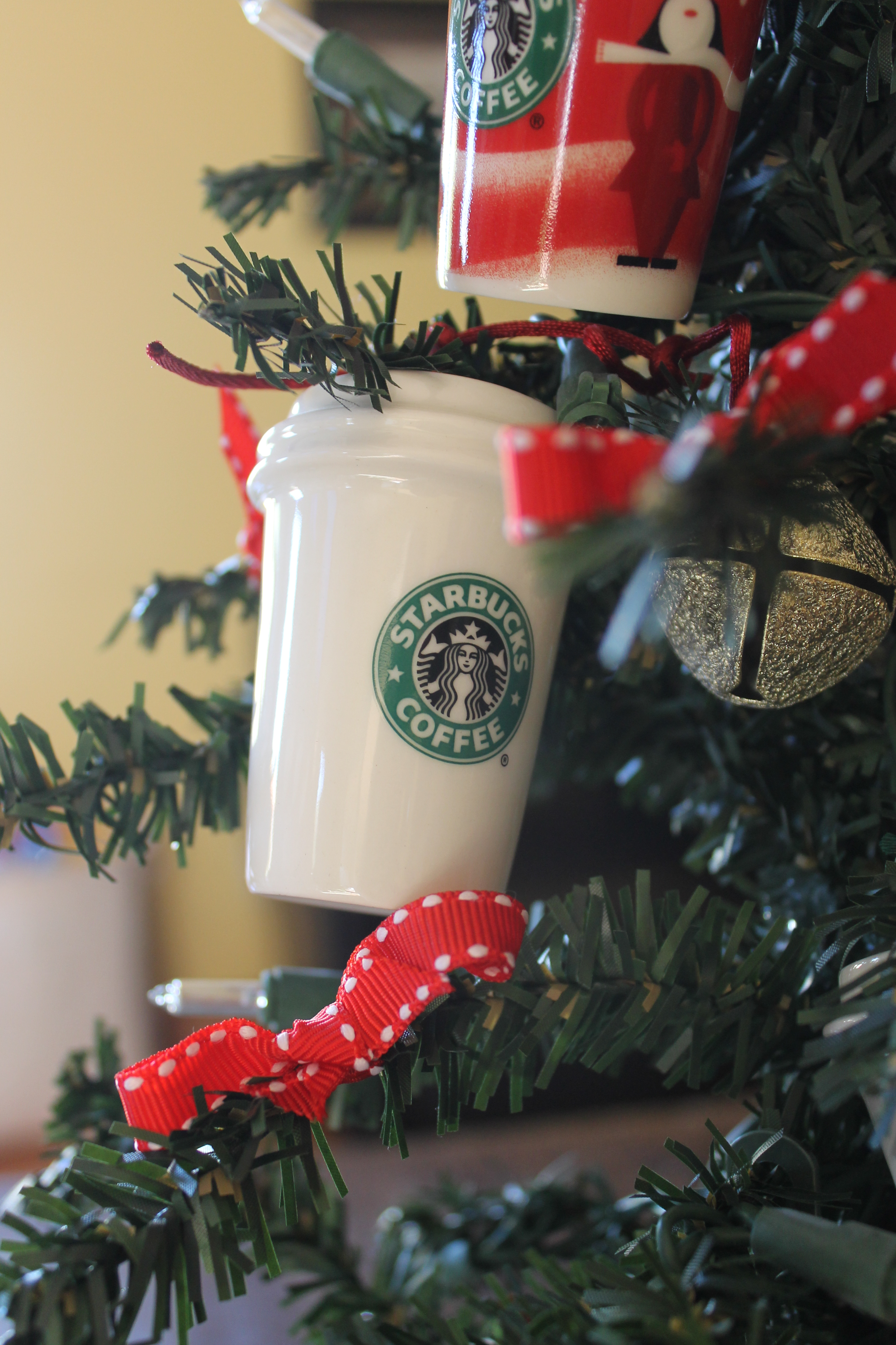My sister, Ali, has always been a lover of Starbucks. She even worked there for a short stint in high school. I knew she had been collecting the mini ornaments they sell at the holidays so I asked her to bring all that she had and compiled them all into a tree.