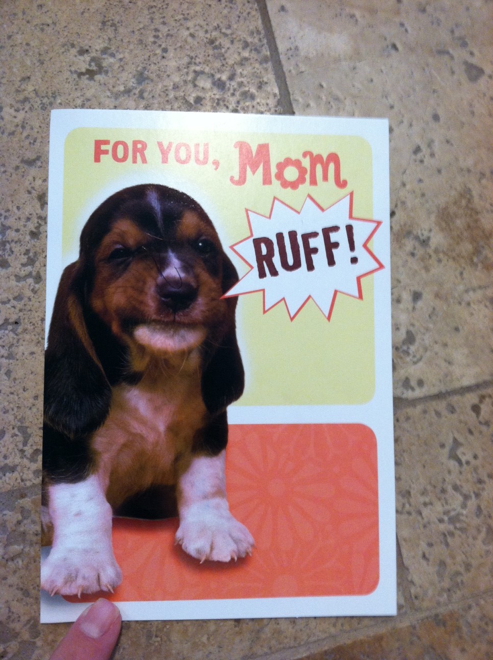 Finally we enjoyed Sunday brunch with Grandma and Grandpa where they showered us with gifts – me, Bay and the baby too! My favorite part though is the card. PW said that Bay screamed “WE HAVE TO GET THE ONE WITH THE PUPPY FOR MOMMY!!!” so loud that people two aisle over were laughing. It cracks me up – exactly what an almost 3 year old would pick out. The gnome stickers are the perfect touch!
