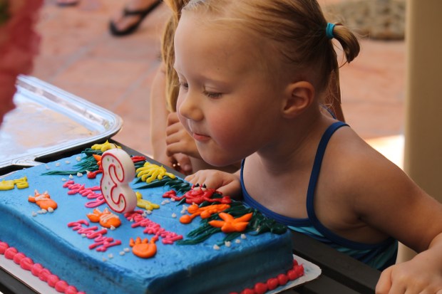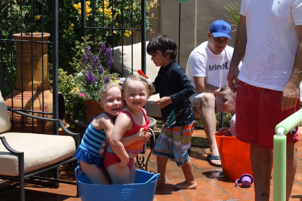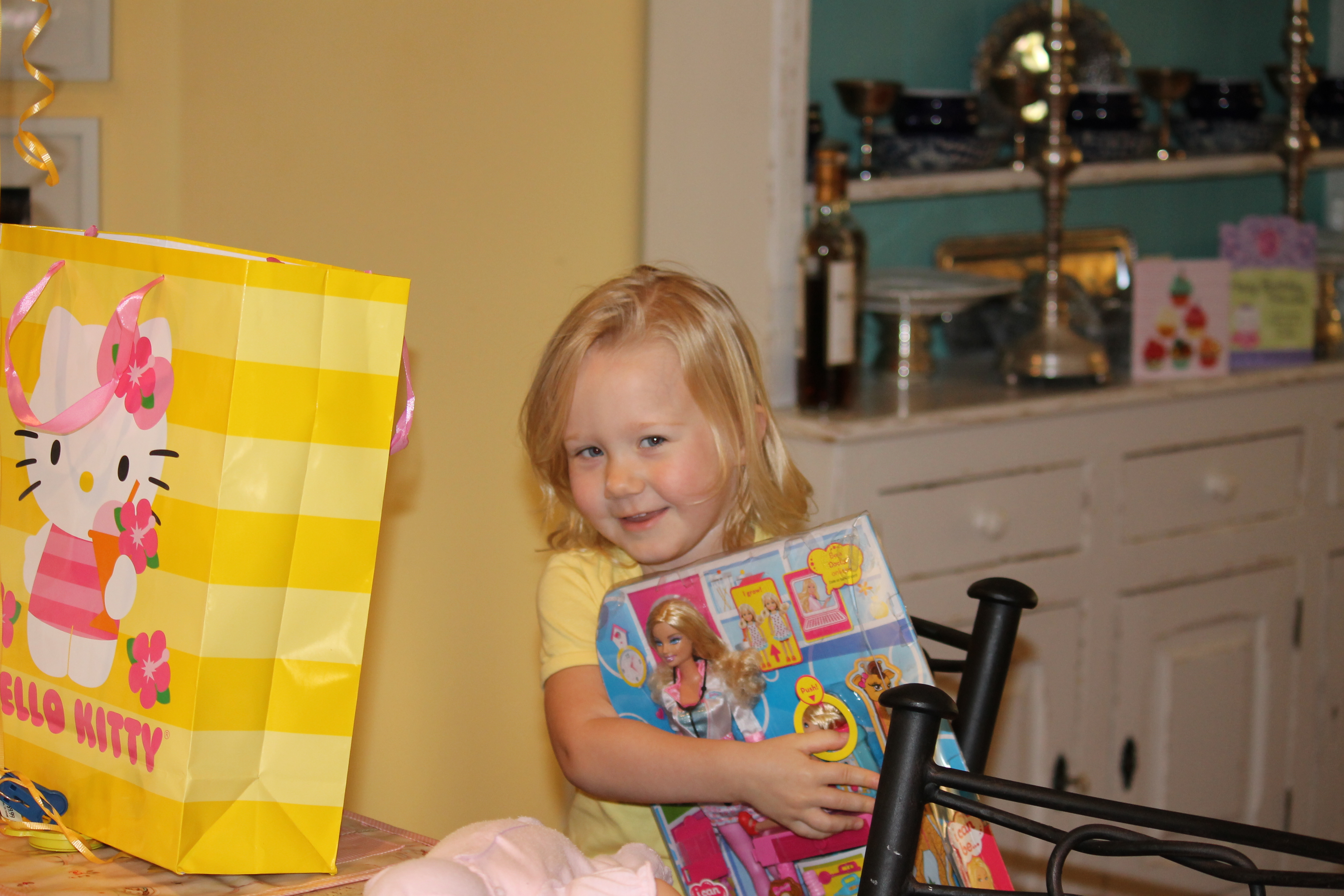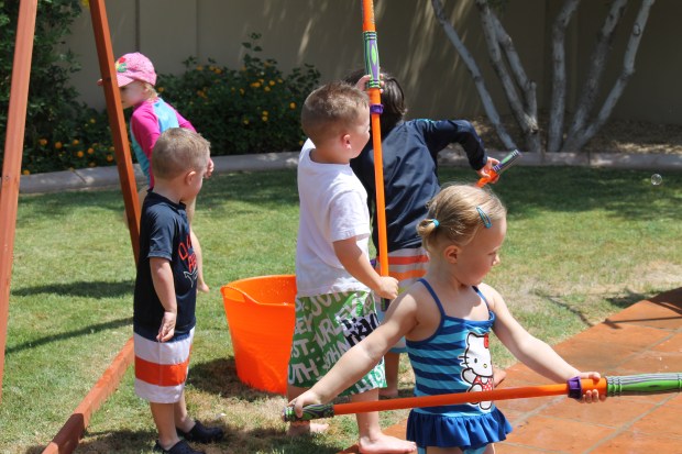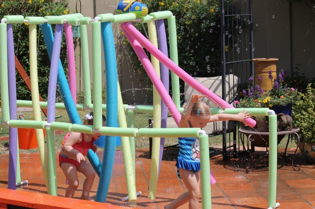 The festivities kicked off with some presents from mom and dad – Dr. Barbie, Hello Kitty everything and pancakes for breakfast. The morning quickly ran into her party for her buddies. PW and I are suckers for backyard shin digs – when we remodeled our house, the phrase “oh, that would be so awesome for a party” came up many, many times. Therefore we spent the last few weeks planning the best splash party any kid without a pool could ever ask for. I started a Pinterest board and had a blast collecting ideas. The best one though was the Kid Car Wash. Peter was pumped for a new hands on project and his creation was amazing. There was also our (ghetto) water slide that consisted of a small pool at the bottom of the swing set slide. Add in some big buckets of water (which turned out to be a hit all on their own), some water balloons and giant squirt guns and we had a hit on our hands!