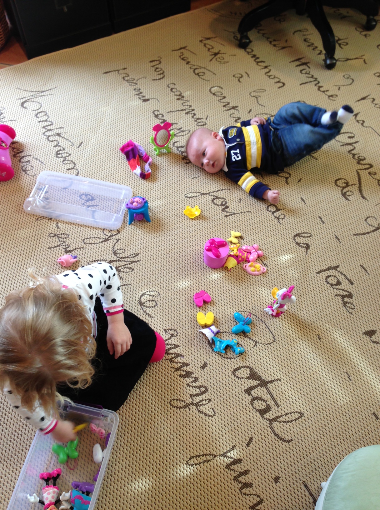 Baylor is is his favorite person, period. He likes me a lot, but I think it’s because I feed him. Once she can share her snacks with him, I’ll be history. He was thrilled to lay on the floor and watch her play with Minnie and Daisy.