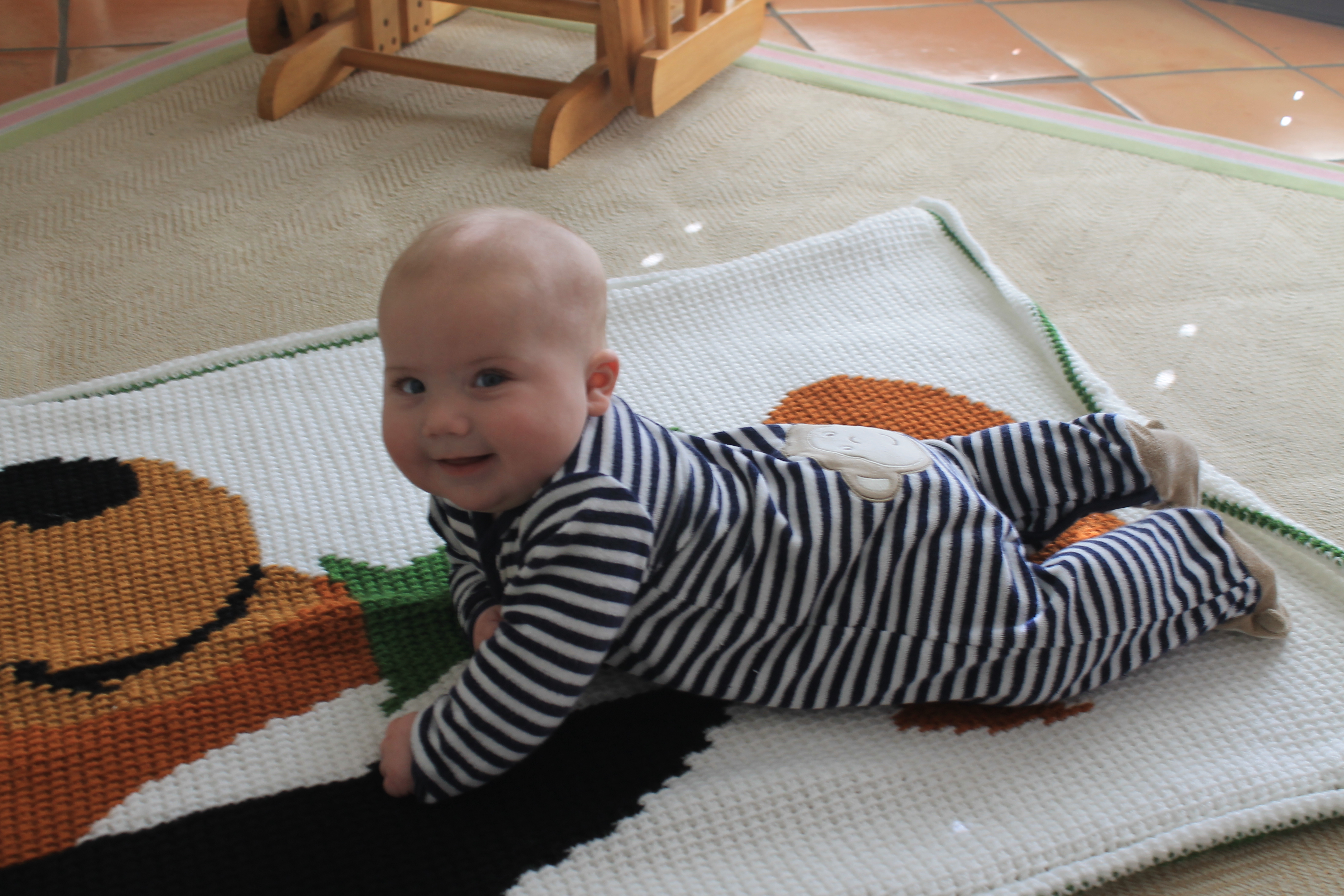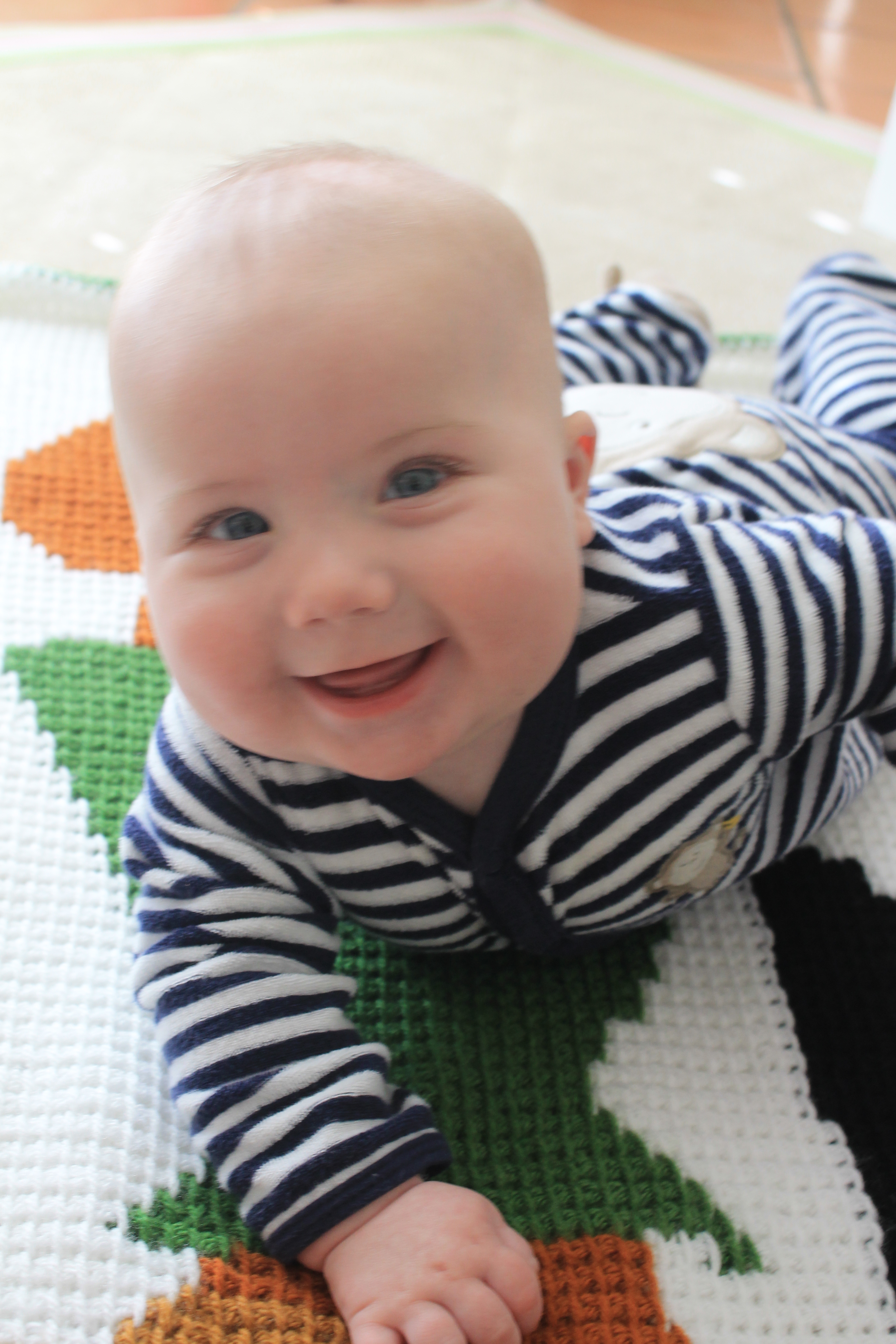 The wild man has continued his growth spurt – 3 lbs and 3 inches these last two months! He’s now 19 lbs 26 inches – 75th and 95th respectively. I knew my shoulders hurt for a reason… He is now grabbing, holding and examining anything he can get his hands on and of course, get into his mouth. He’s getting close to sitting up without help and is desperately trying to get his swimming arms and legs coordinated enough to crawl and keep up with his cousin, Mason. Who he currently out weighs despite Mason being 6 months older.