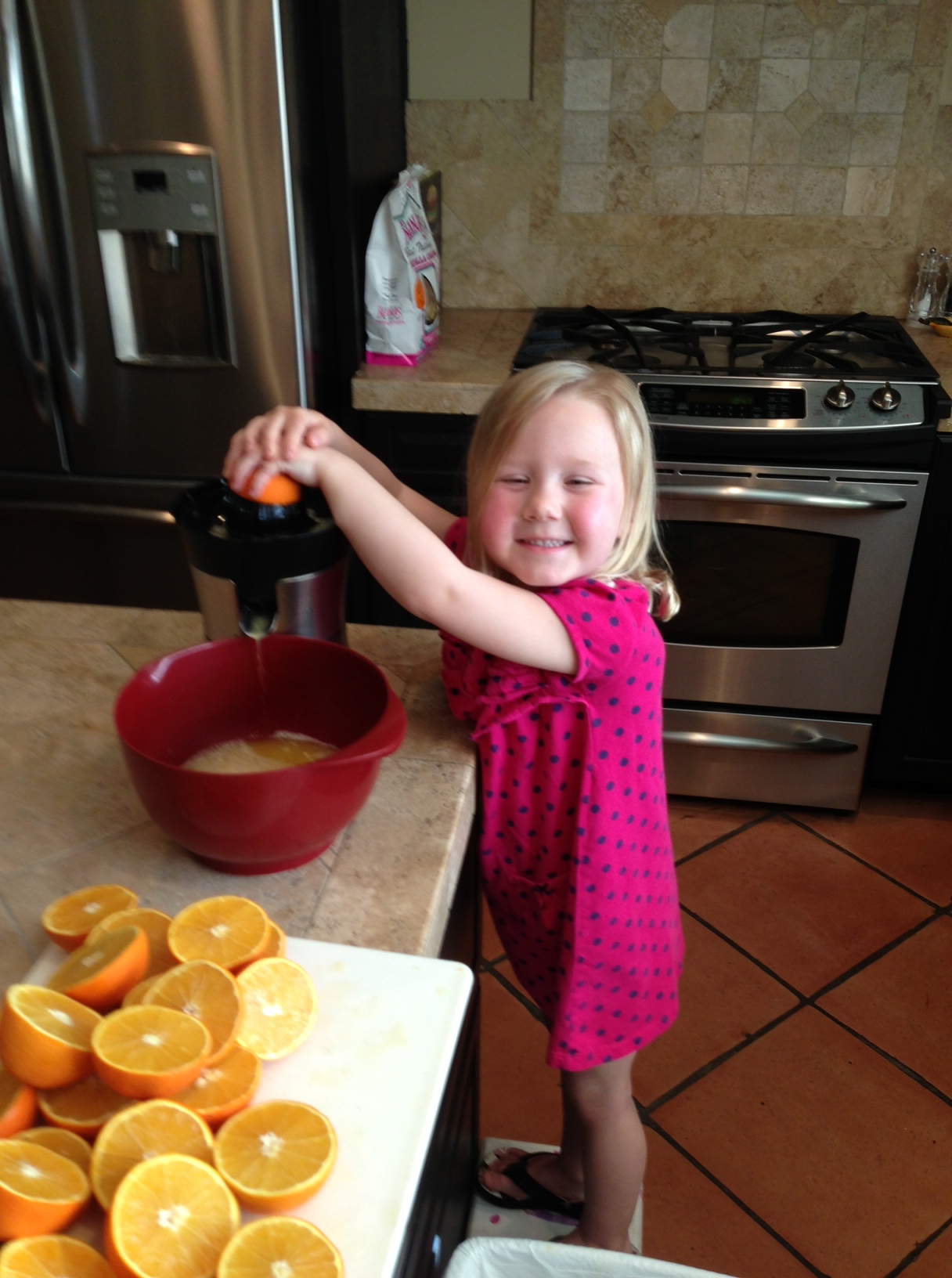 Anyway, I got a new juicer that was easier for Baylor to use and we set out to juice about 75 oranges this morning. She gave up after about 20 but Auggie and I made it through the rest of the bags. Three pretty bottles of juice were our prize!