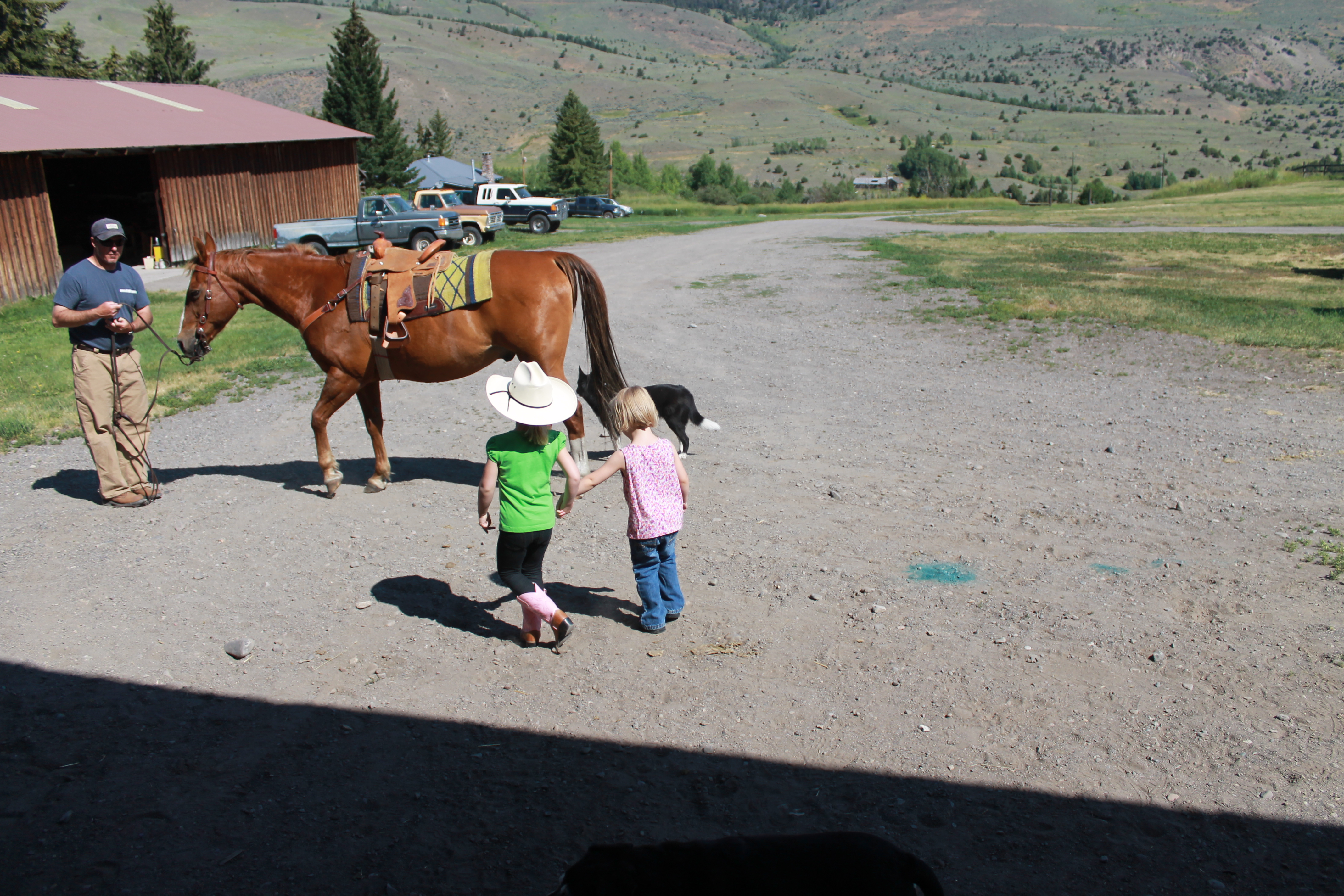 Ms. B has been dying to ride horse since taking the Mini Horse Hands class last summer at the zoo. When we went down to feed the horses some carrots, she began begging us to let her ride. Thankfully, Uncle Mike agreed to take both B and cousin Zoe for a spin around the corral.