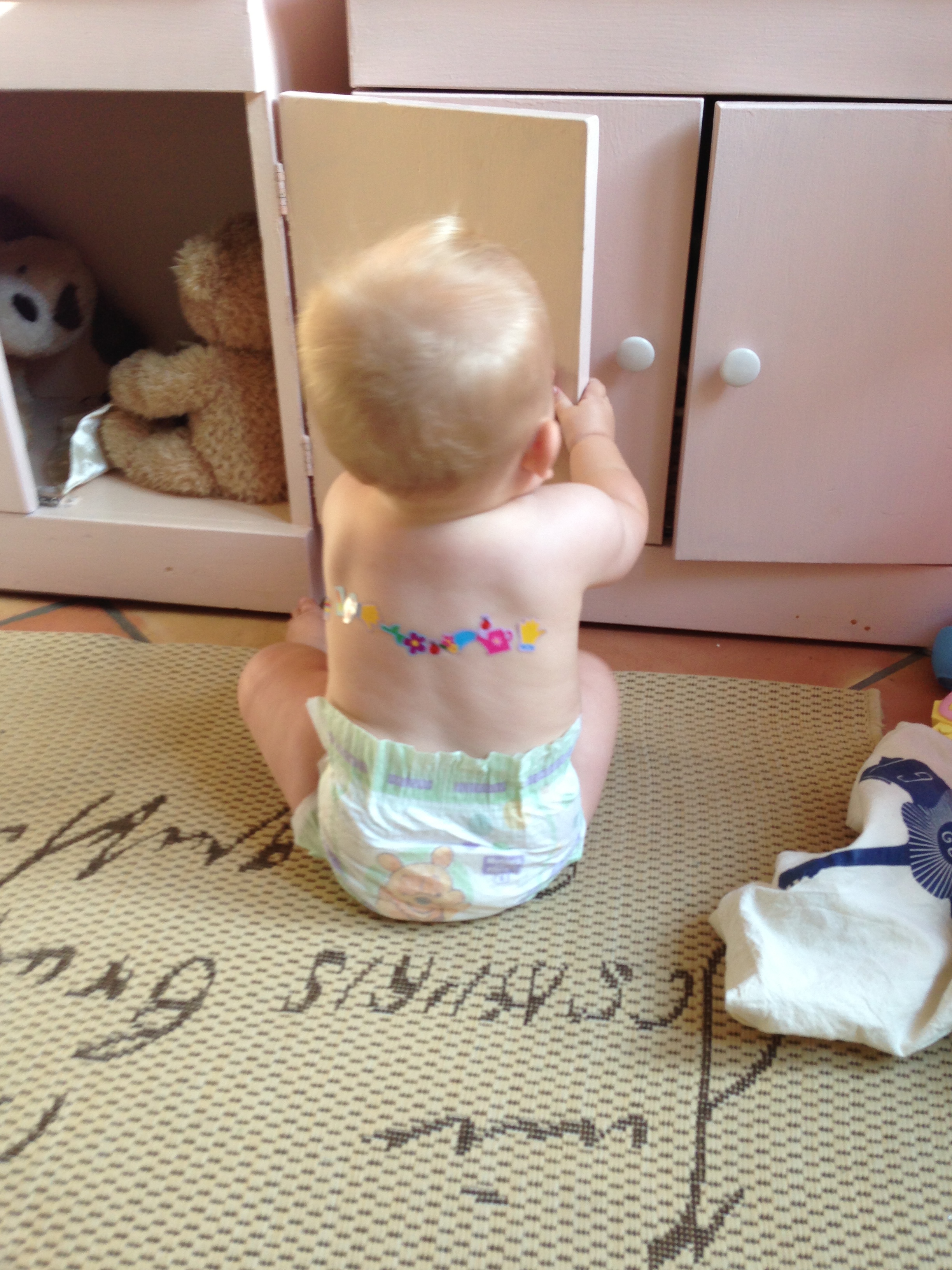 He’s trying hard to crawl – he gets on his hands and knees and rocks so hard that it scoots the PnP across the floor…