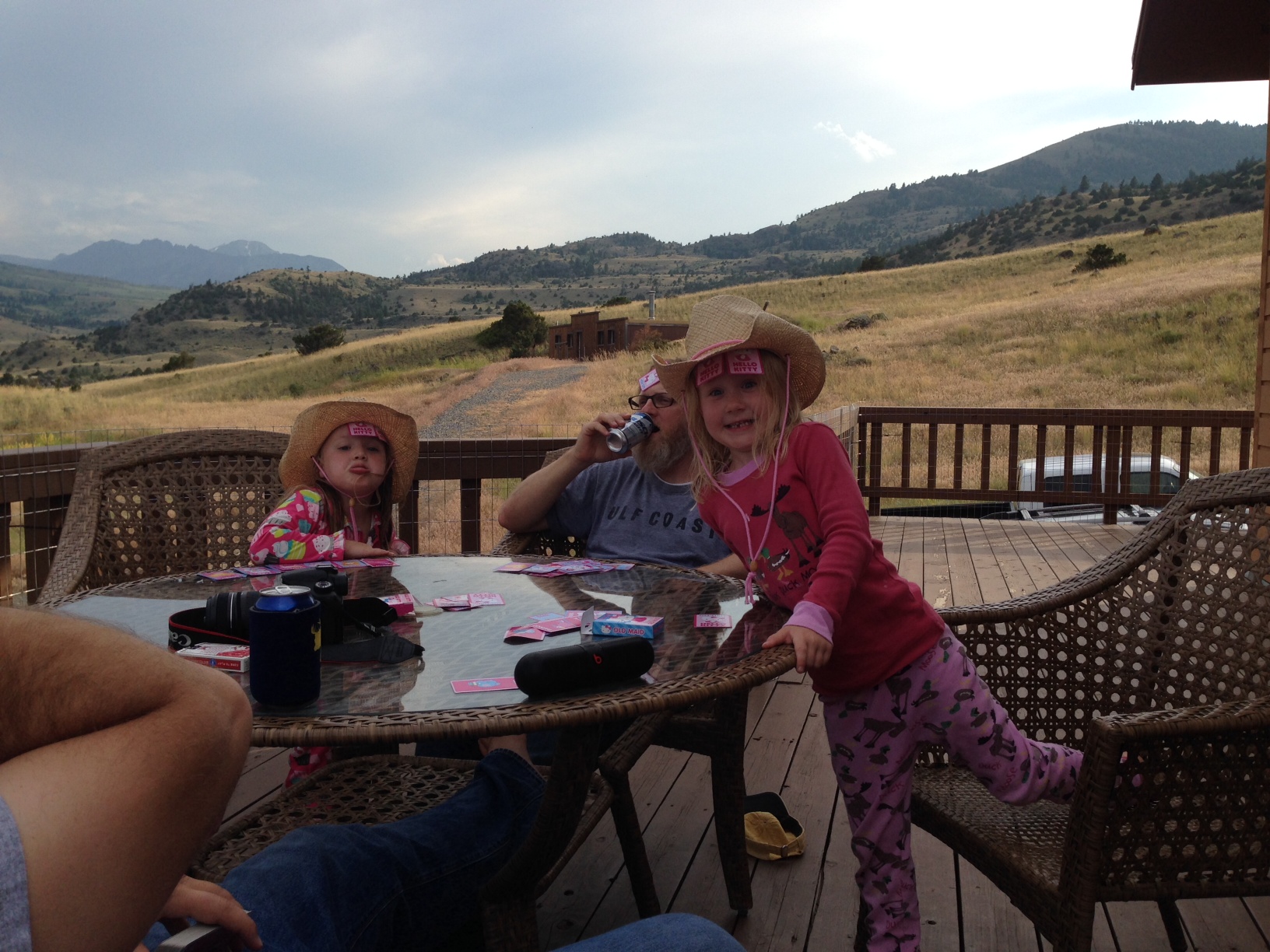 I can’t stand this picture. It kills me. The girls are THRILLED to be playing the hardest game of Go Fish (no numbers, only names, they can’t read. You get the picture.) ever and Jeff is physically in pain over it. I’m laughing as I type.