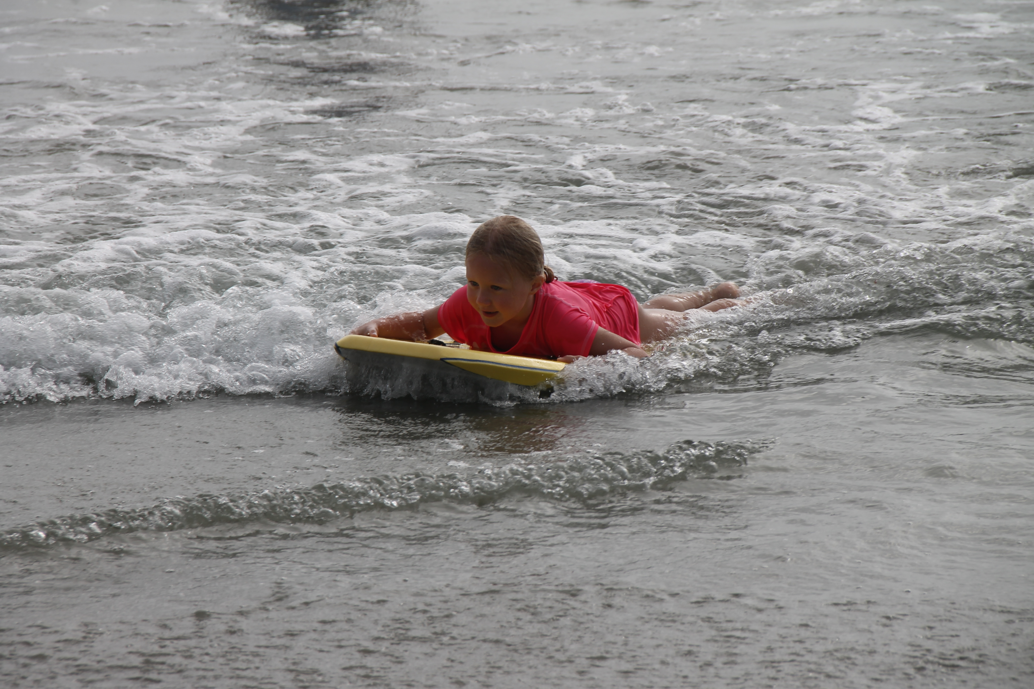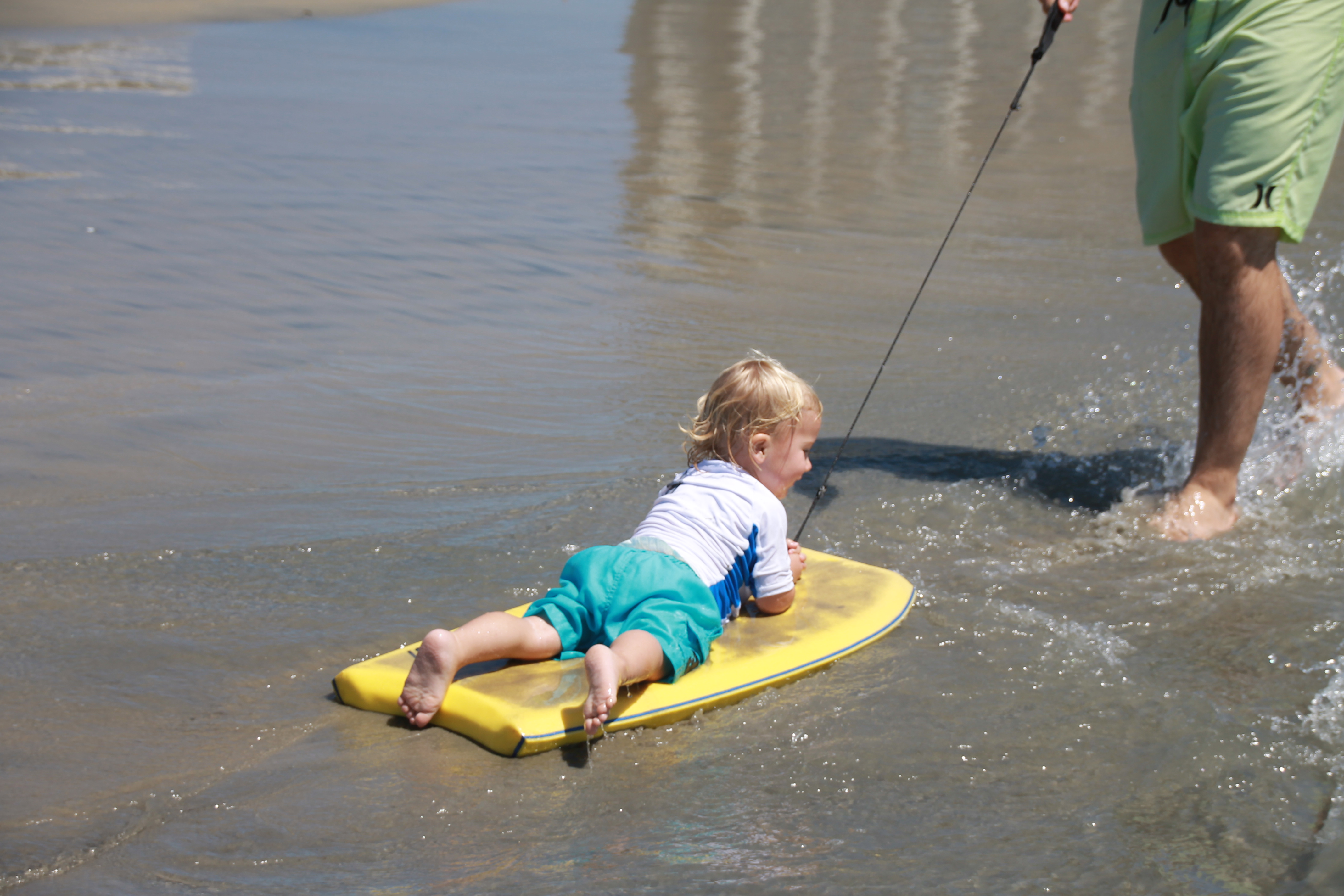 Both of them are crazy for the water. They like to run into it, swim, dive, fall over, run from it and repeat. As Baylor and I were holding hands and jumping over the waves that rolled our way, I asked her if she wanted to try boogie boarding (body boarding? I don’t know what the kids are calling it these days). I love to go out on the boogie board. As kids, we spent hours sitting, watching, waiting, riding and paddling back out. We learning which waves were the good ones, when to catch them and how to ride all the way to the sand. Being on a board in the cold, salty water on a hot day are some of my most favorite childhood memories.