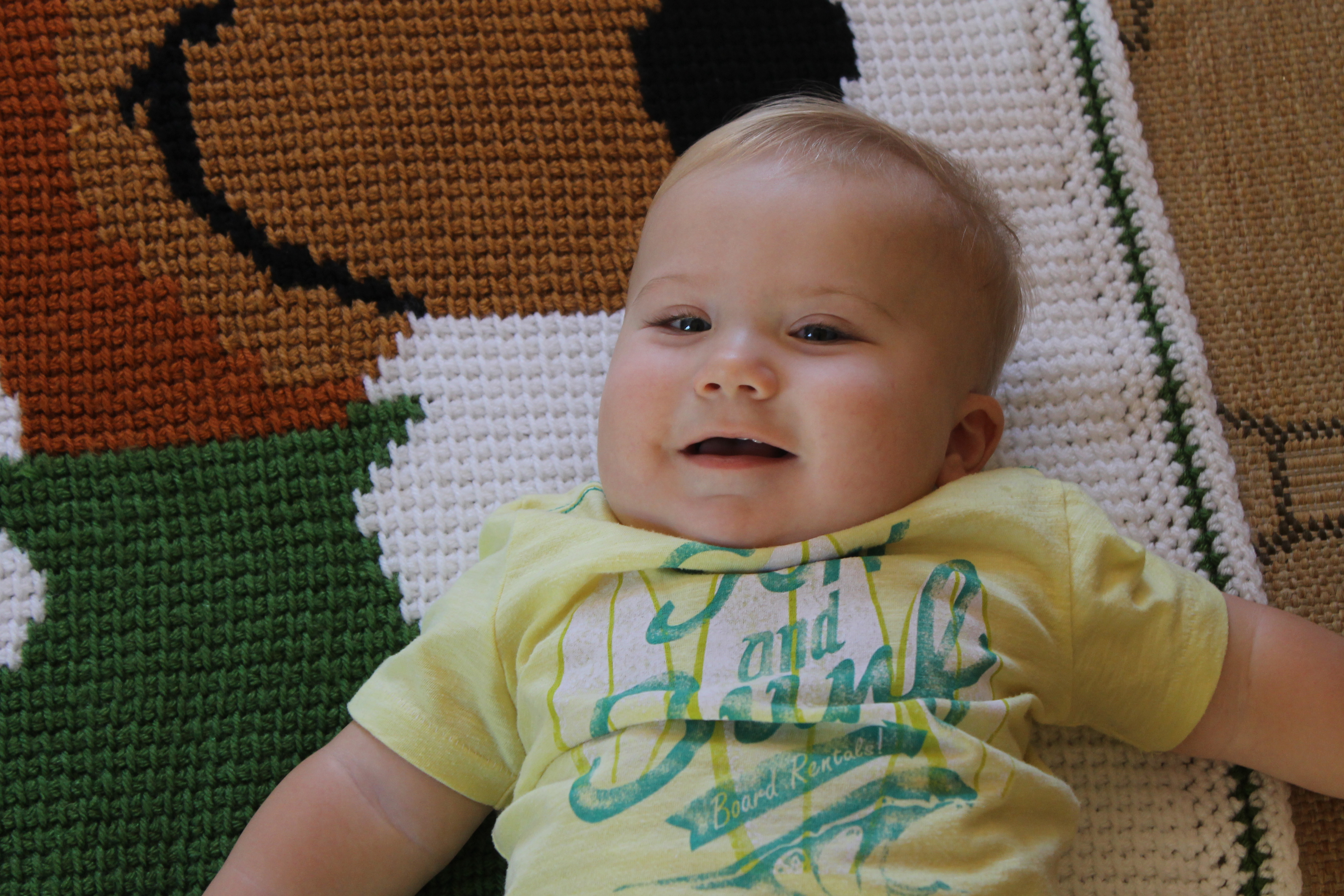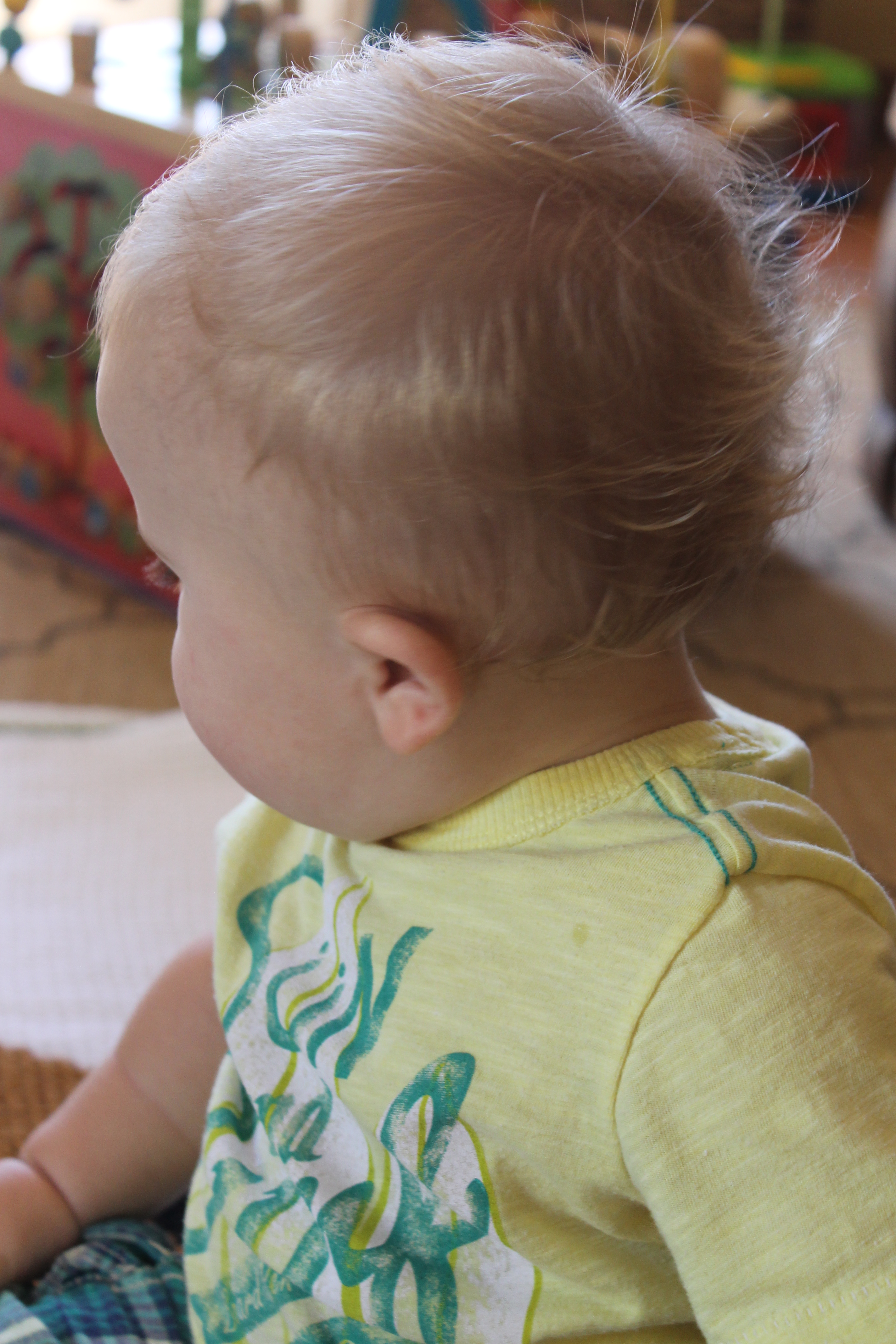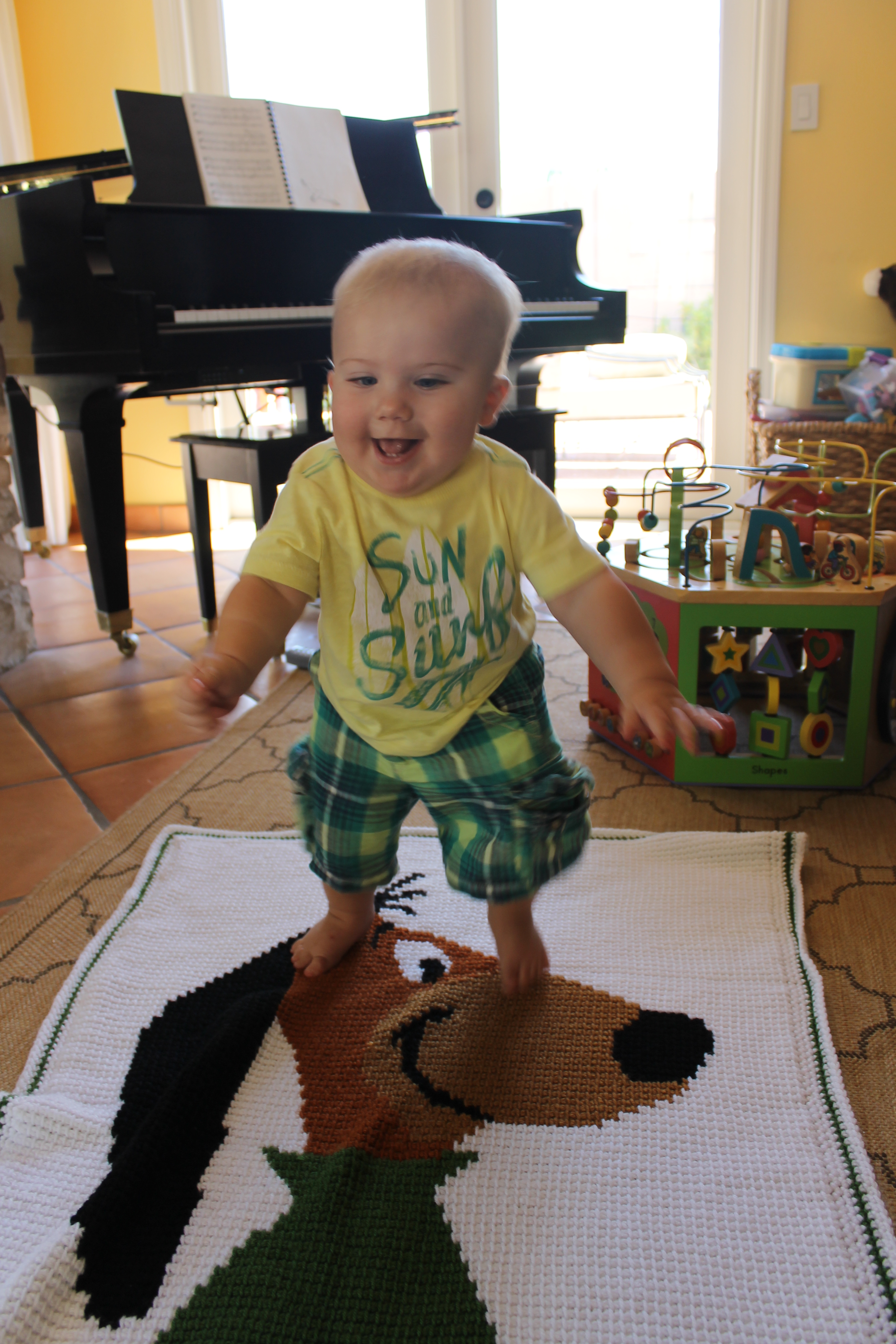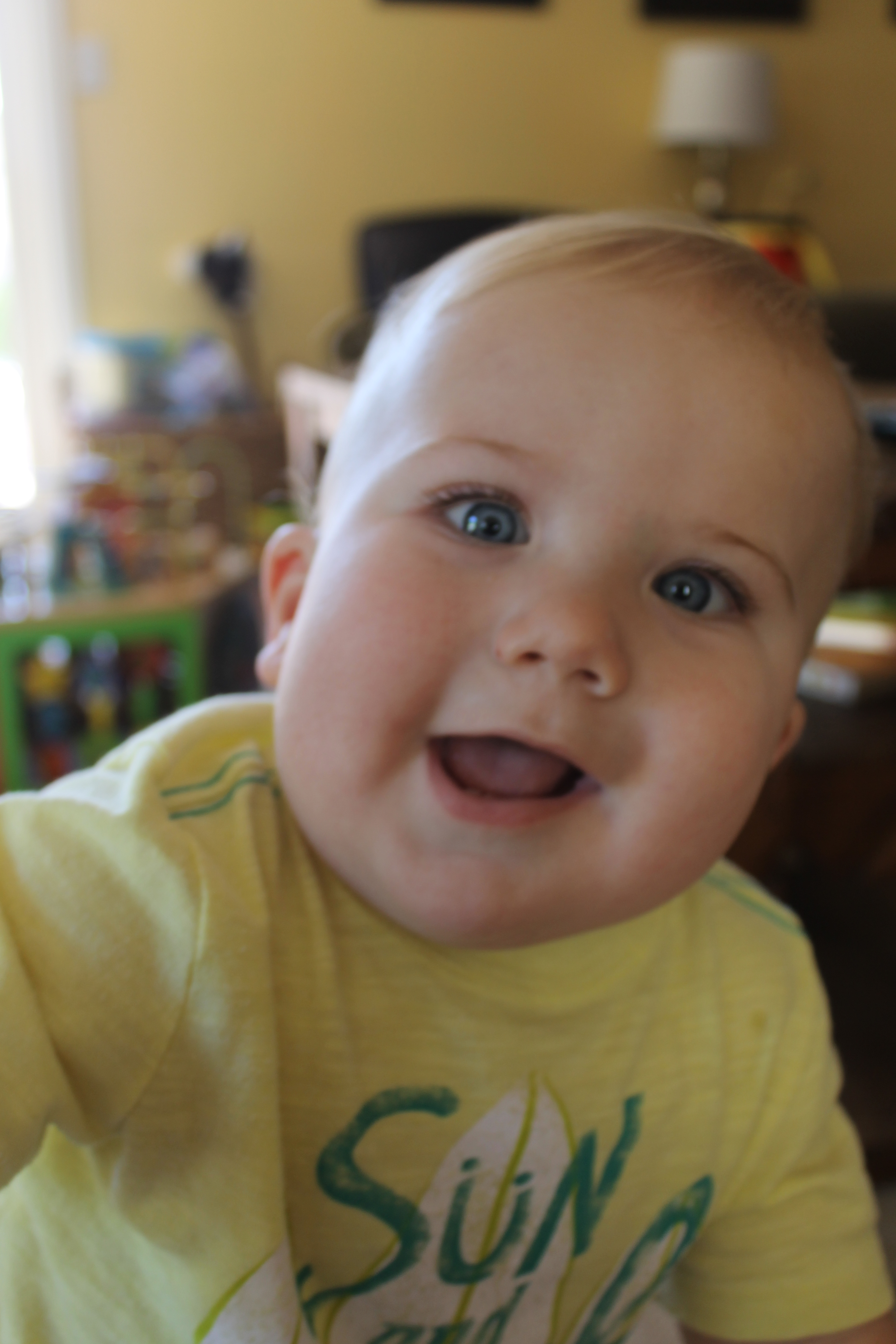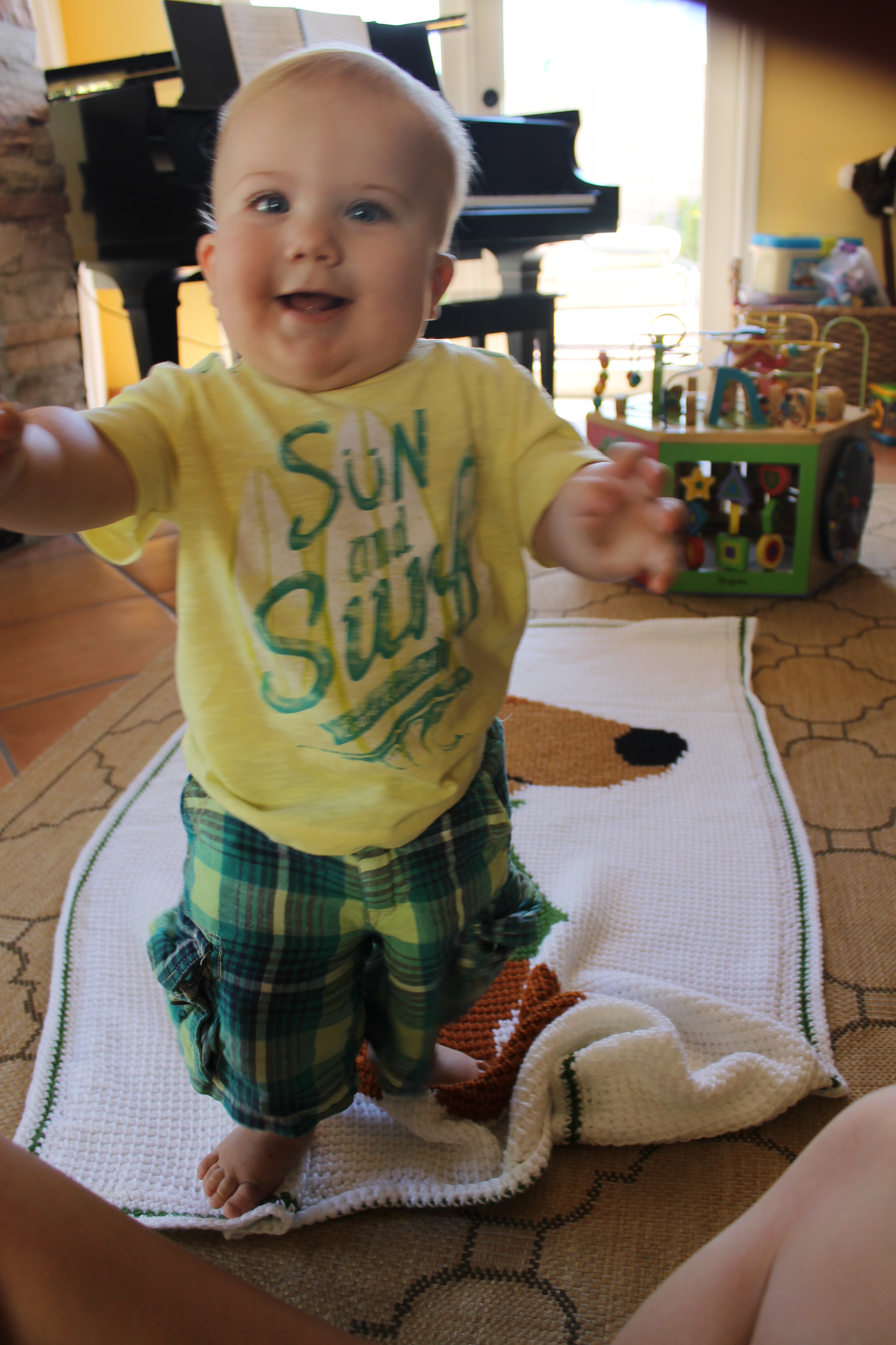 The big man is once again off the charts for height and weight at 31 inches and 25 pounds.  He is getting very skilled at “hands up stand up!!” and has even taken a few unassisted steps – yeah for my aching back! Can’t believe it’s almost time to start planning this little stinker’s birthday party.