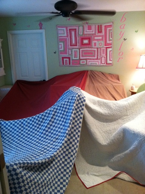 Peter and I both have great memories of fort building as kids. Inside, outside, with sheets, beach towels, quilts, whatever was handy. It seems that he hasn’t lost his touch. We spent a good hour playing, eating, reading and crawling in and out of the improvised shelter. Bay then spent another hour doing the same with Bear T. Dog. There were many tears when we had to deconstruct the new play area for nap time, so we left one sheet over her crib. It’s still there and I’m not sure we’re ever going to get it back.