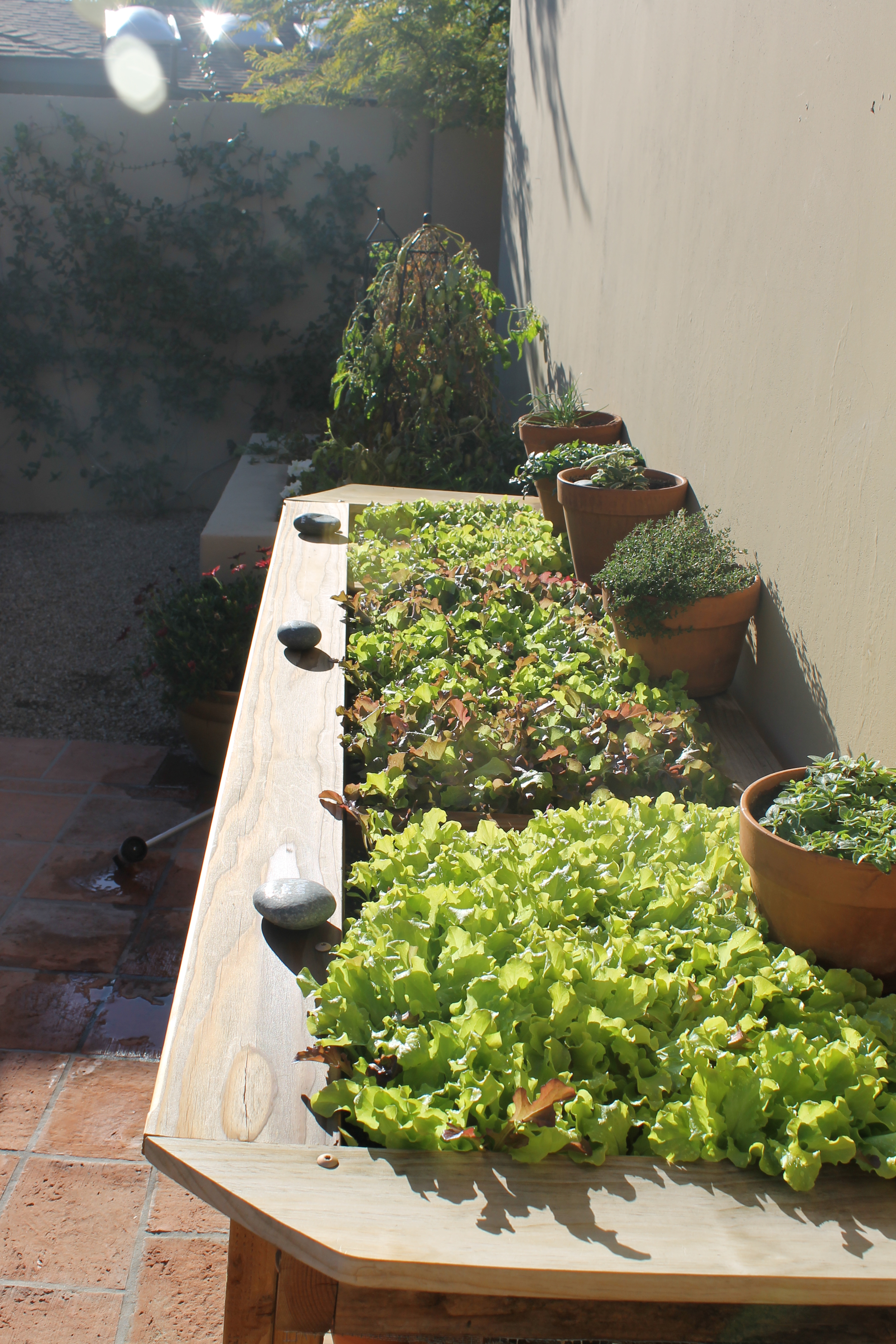 Now, finally after many weeks of building, stucco, planning, redoing, planting and fertilizing – the garden is growing! And it looks amazing. Every time I catch a glimpse of this space, it makes me so happy.